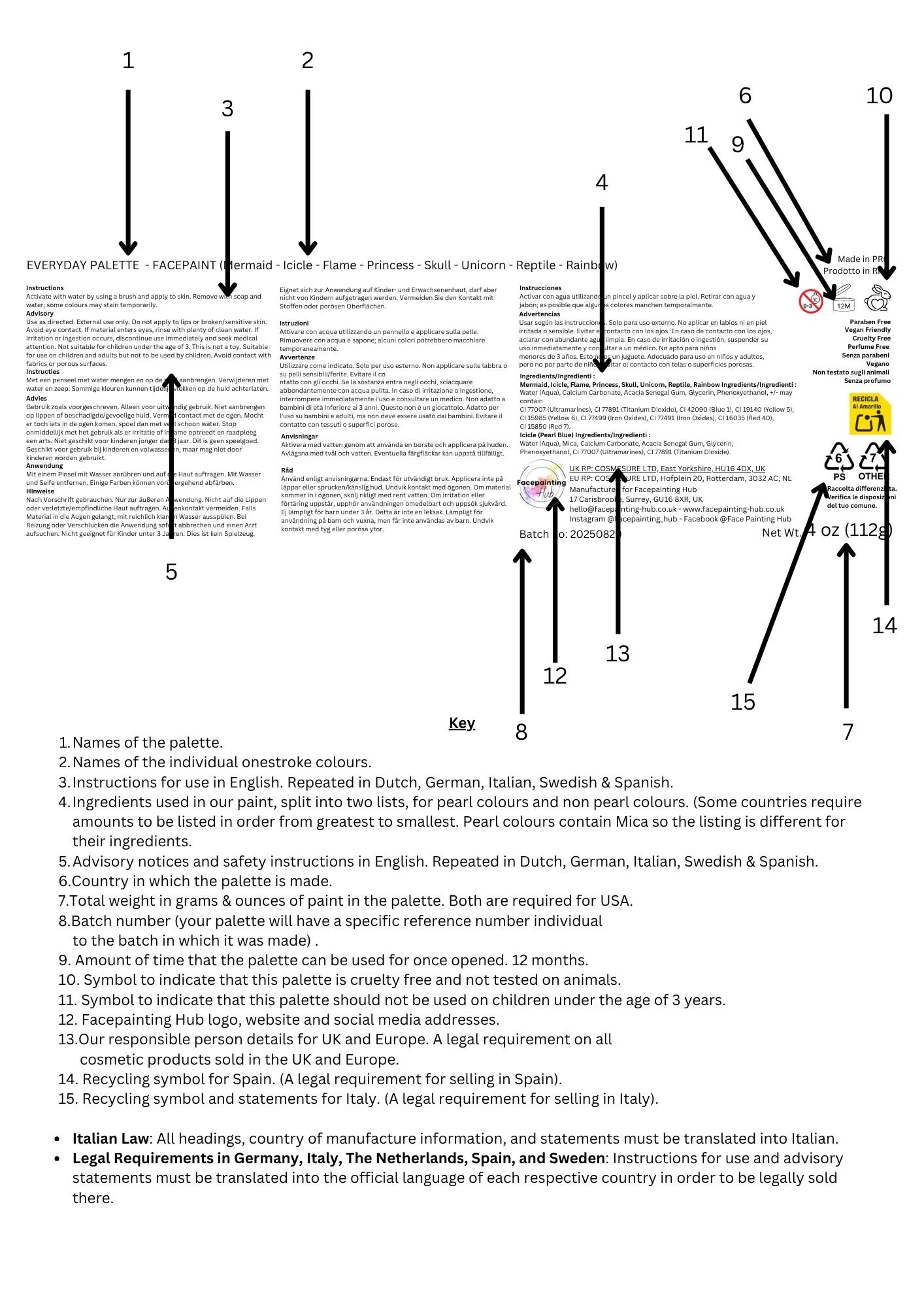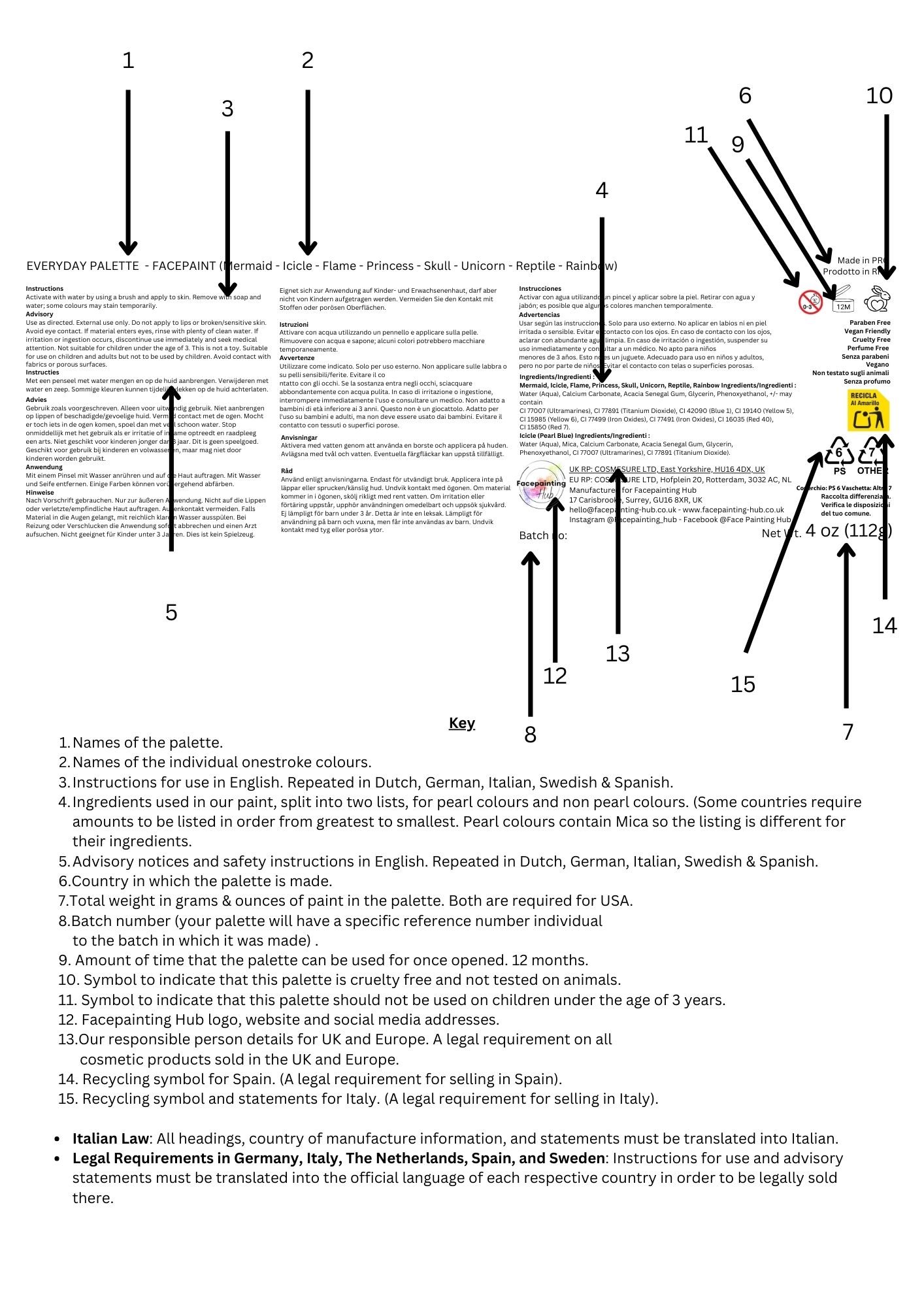 minimum legal requirements shall not be allowed”, on this basis Facepainting Hub has not included a statement on the label that the product is compliant with Regulation (EC) 1223/2009 as this would be non-compliant.